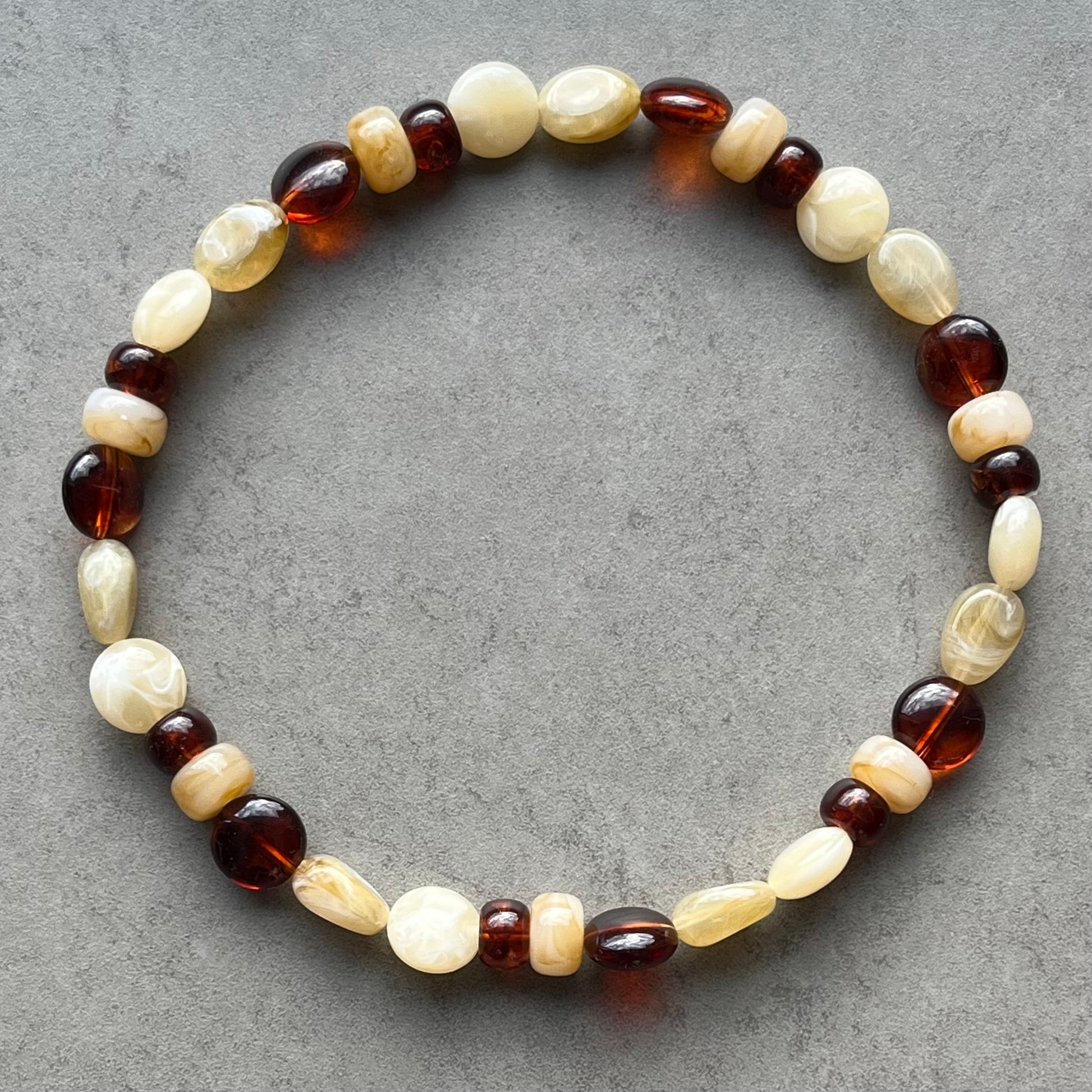 Composé de perles acryliques aux formes et tailles variées, il joue sur les nuances naturelles de miel, d’ivoire et d’ambre pour créer un éclat chaud et solaire.