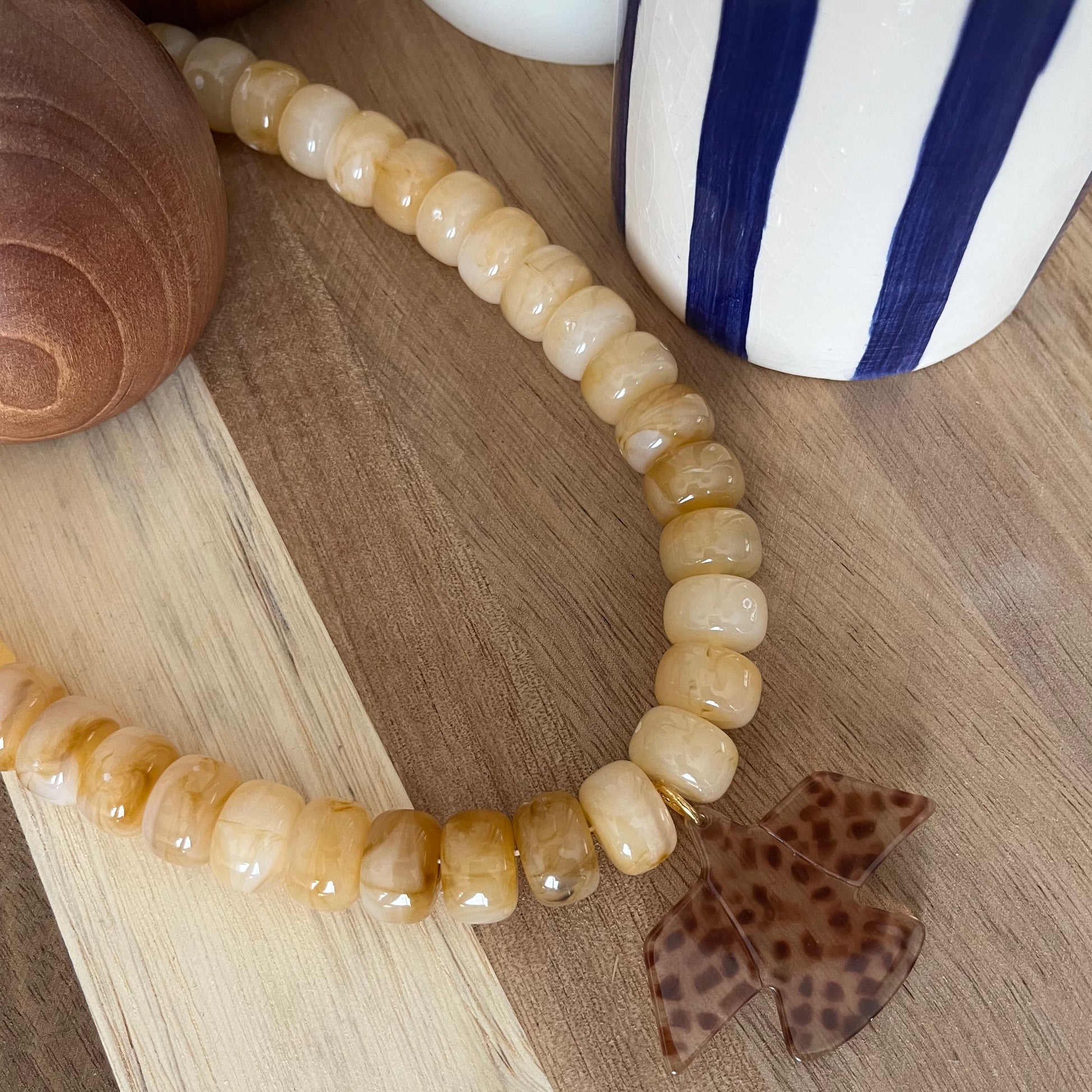 Il est composé de perles rondes en acrylique aux nuances rouge orangé ou beige et miel, rappelant les terres chaudes et solaires.